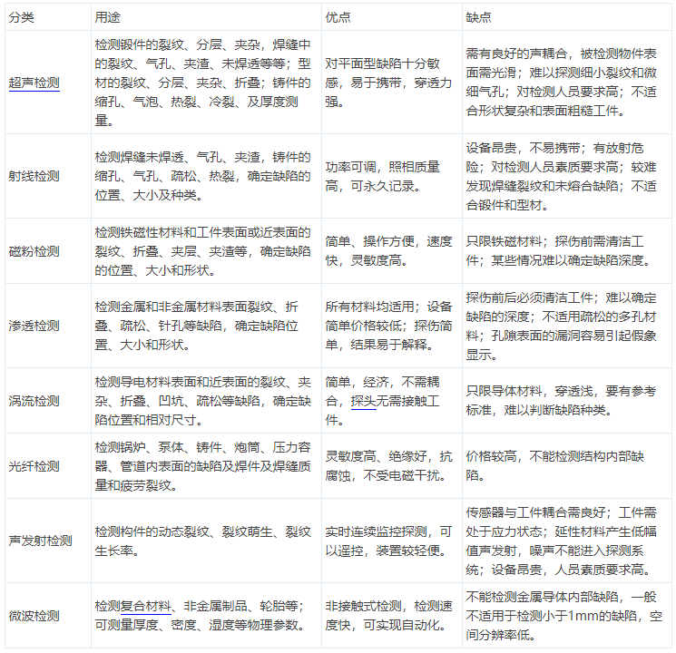 目前實際應(yīng)用中有很多種無損檢測方式,除了射線、超聲、磁粉、滲透、渦流這五大常規(guī)檢測之外,還有微波、聲發(fā)射、激光、紅外等等,下面為大家介紹的是幾種常用的無損檢測方式的用途、優(yōu)缺點。